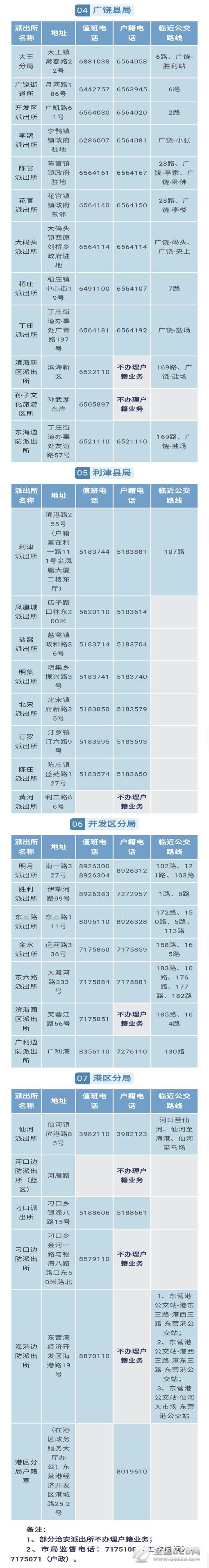 山东省东营市辖区广饶县、利津县、开发区、港区各派出所地址、值班电话、户籍电话以及临近公交线路: