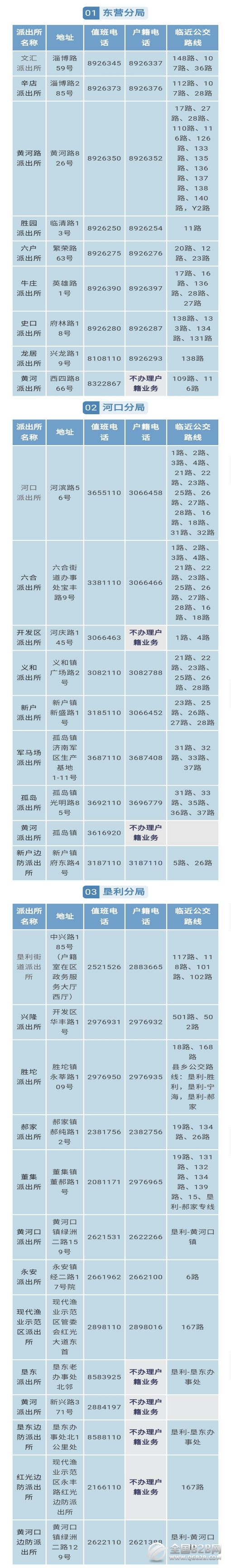 山东省东营市辖区东营区、河口区、垦利区各派出所地址和电话,以及临近公交线路。