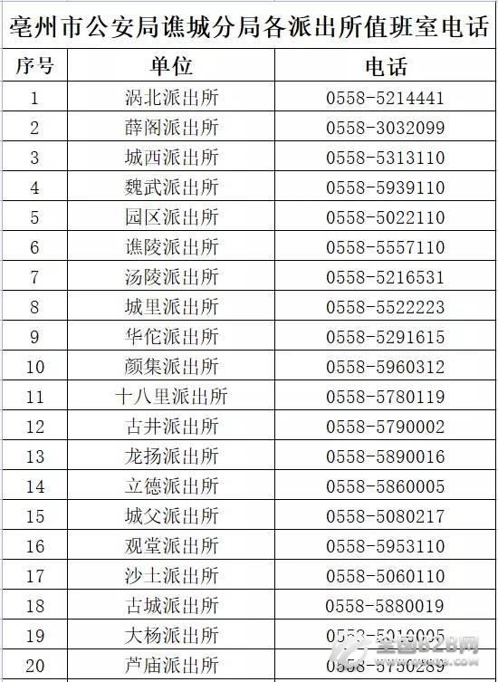 亳州市谯城区各派出所值班室电话大全表:为更好的服务群众,拓宽群众报警和咨询渠道,亳州市谯城分局现向社会公布各派出所值班室电话。如有治安、刑事类举报、违法犯罪线索举报或户籍、出入境类问题可直接拨打辖区派出所办公值班电话。亳州市谯城区各派出所值班室电话大全表如下: