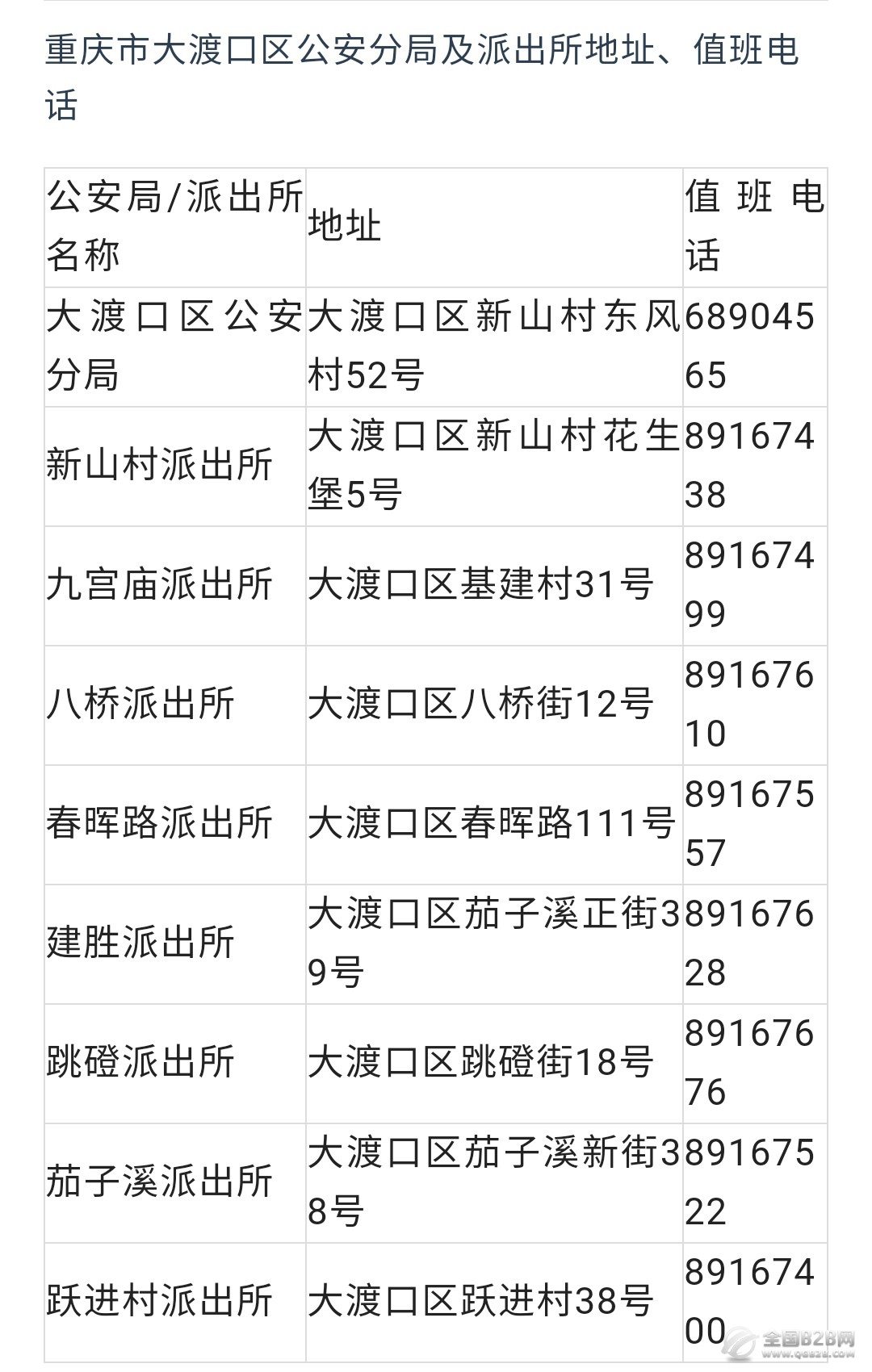 重庆市大渡口区各派出所办公地址和值班电话汇总信息表:重庆市大渡口区各派出所地址和值班电话汇总信息。想要办个户口、碰到各类事件等情况,免不了要找派出所。为进一步方便群众办理相关业务,提高办事效率,重庆市大渡口区在这里汇总了区内各派出所详细地址、电话,希望能方便在大渡口当地的您!便民:重庆市大渡口区各派出所办公地址和值班电话汇总信息表如下: