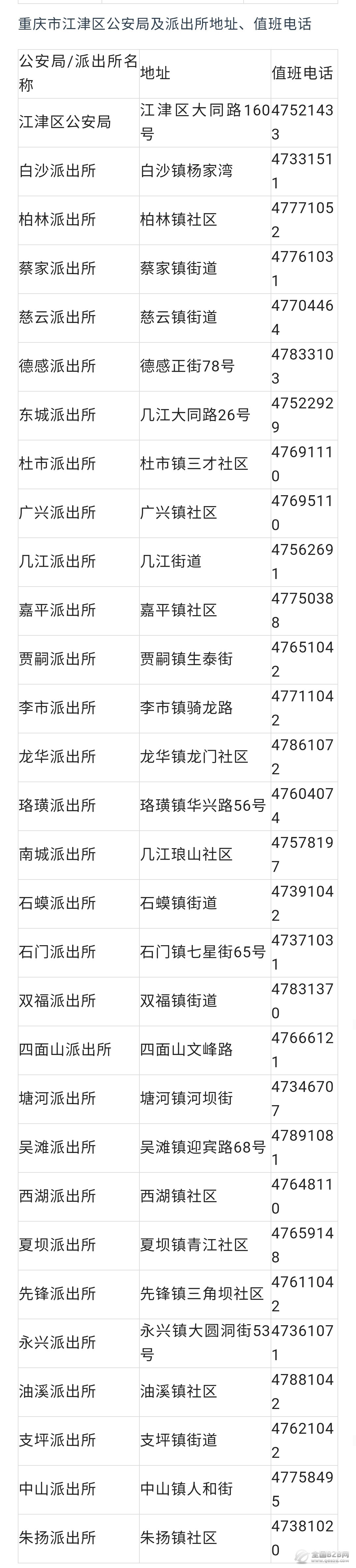 重庆市江津区各派出所值班电话和办公地址一览表:生活中,想要办个户口、碰到各类事件等情况,免不了要找派出所。为进一步方便群众办理相关业务,提高办事效率,重庆市江津区在这里汇总了辖区内各派出所详细地址、值班电话,希望能方便在江津区当地的您!重庆江津区各派出所值班电话和地址一览表如下: