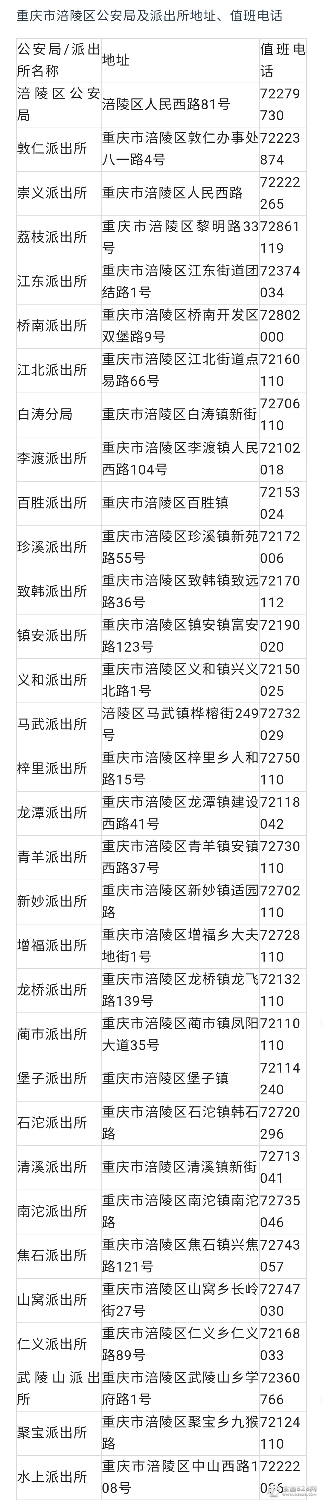 重庆市涪陵区各派出所值班电话和办公地址信息汇总表:重庆市涪陵区为进一步方便广大人民群众,对全区派出所电话和地址进行了汇总,现将重庆市涪陵区各个派出所值班电话和地址汇总目录公布给大家,如有需要派出所处理的问题可直接拨打电话,或者直接去派出所咨询办理。重庆市涪陵区各派出所将以热情地服务、快速地反应、高效地服务,全力提升人民群众安全感满意度。重庆市涪陵区各派出所值班电话和地址信息汇总表如下: