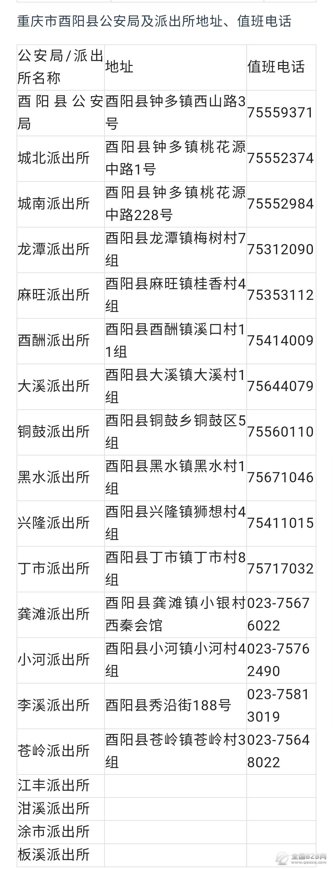 说明:关于重庆市酉阳县各派出所值班电话和详细地址汇总表的信息作出免责说明,本信息发布的目的仅为向公众提供更多的便民利民服务,是建立在公共服务信息基础上的公益信息传播,其信息来源于当地主管机构的公开内容。信息不排除因随着时间或者相关情况发生原因而发生变化变更,所以本信息仅作参考。本信息旨在通过网络提供更多相关便民利民服务信息,本信息的真实性以相关部门正式披露信息为准。如有错误之处或者如有侵权,请及时联系本网站客服,定会及时修改或者删除。