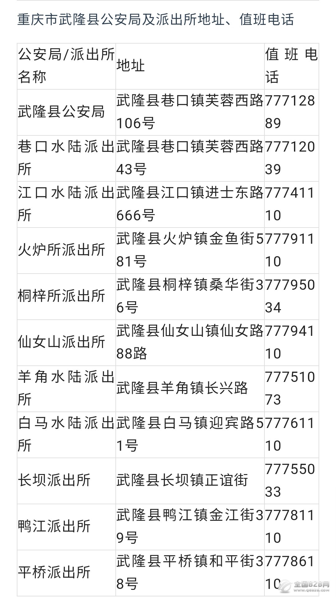 声明:关于重庆市武隆县辖区派出所值班电话和办公地址大全表的信息作出免责声明,本信息发布的目的仅为向公众提供更多的便民利民服务,是建立在公共服务信息基础上的公益信息传播,其信息来源于当地主管机构的公开内容。信息不排除因随着时间或者相关情况发生原因而发生变化变更,所以本信息仅作参考。本信息旨在通过网络提供更多相关便民利民服务信息,本信息的真实性以相关部门正式披露信息为准。如有错误之处或者如有侵权,请及时联系本网站客服,定会及时修改或者删除。