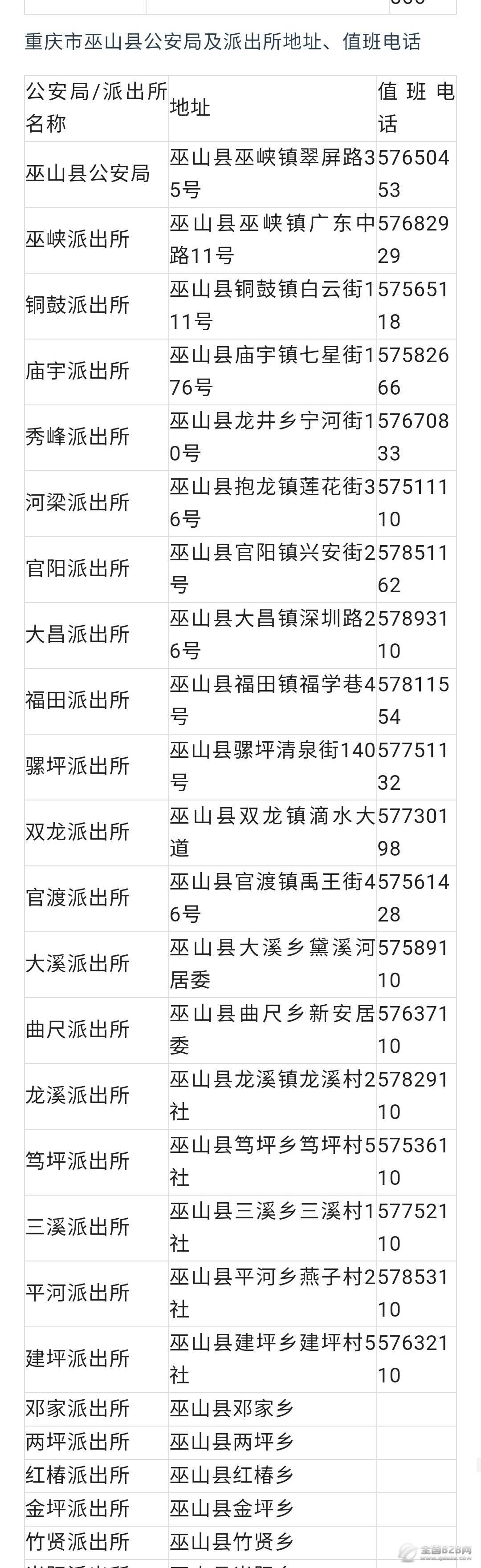 说明:关于重庆市巫山县各派出所地址和联系电话汇总表的信息作出免责说明,本信息发布的目的仅为向公众提供更多的便民利民服务,是建立在公共服务信息基础上的公益信息传播,其信息来源于当地主管机构的公开内容。信息不排除因随着时间或者相关情况发生原因而发生变化变更,所以本信息仅作参考。本信息旨在通过网络提供更多相关便民利民服务信息,本信息的真实性以相关部门正式披露信息为准。如有错误之处或者如有侵权,请及时联系本网站客服,定会及时修改或者删除。