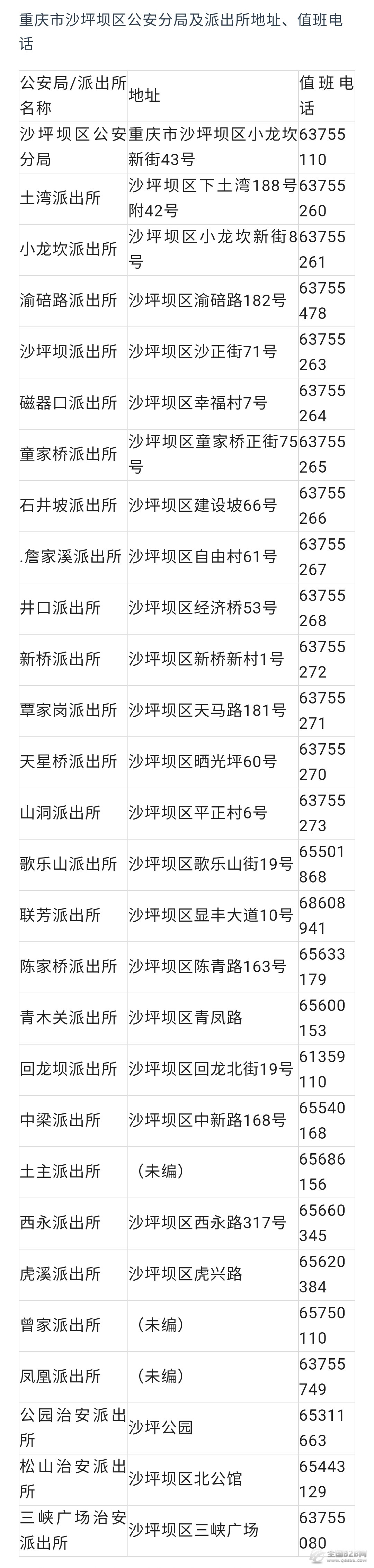 声明:关于重庆市沙坪坝区各派出所联系电话和办公地址汇总表的信息作出免责说明,本信息发布的目的仅为向公众提供更多的便民利民服务,是建立在公共服务信息基础上的公益信息传播,其信息来源于当地主管机构的公开内容。信息不排除因随着时间或者相关情况发生原因而发生变化变更,所以本信息仅作参考。本信息旨在通过网络提供更多相关便民利民服务信息,本信息的真实性以相关部门正式披露信息为准。如有错误之处或者如有侵权,请及时联系本网站客服,定会及时修改或者删除。