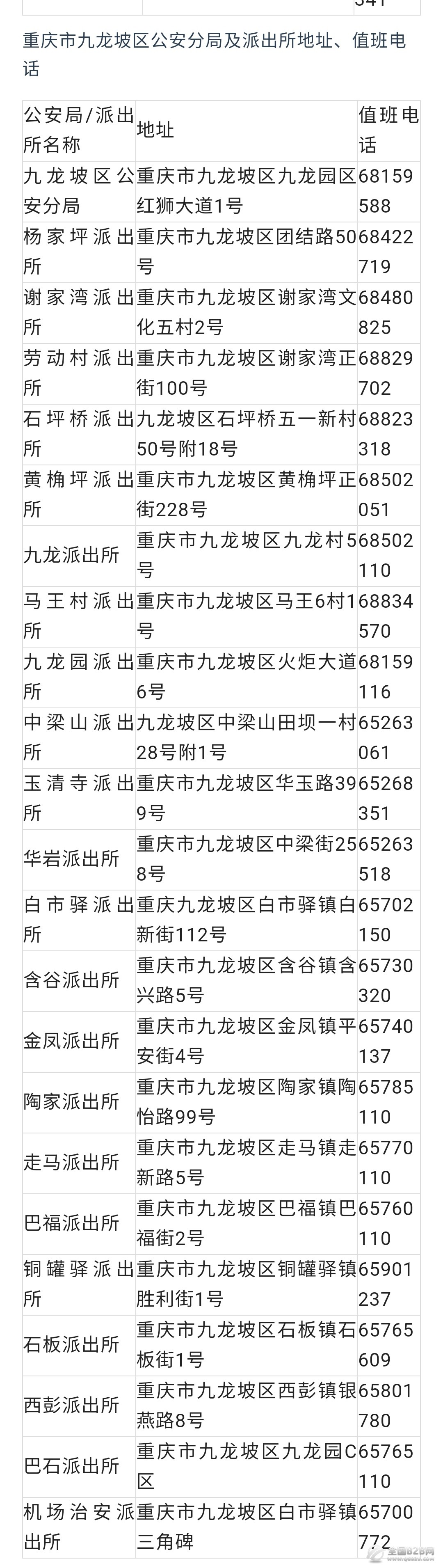 特别说明:关于重庆市九龙坡区各派出所办公地址和值班电话汇总表的信息作出免责说明,本信息发布的目的仅为向公众提供更多的便民利民服务,是建立在公共服务信息基础上的公益信息传播,其信息来源于当地主管机构的公开内容。信息不排除因随着时间或者相关情况发生原因而发生变化变更,所以本信息仅作参考。
