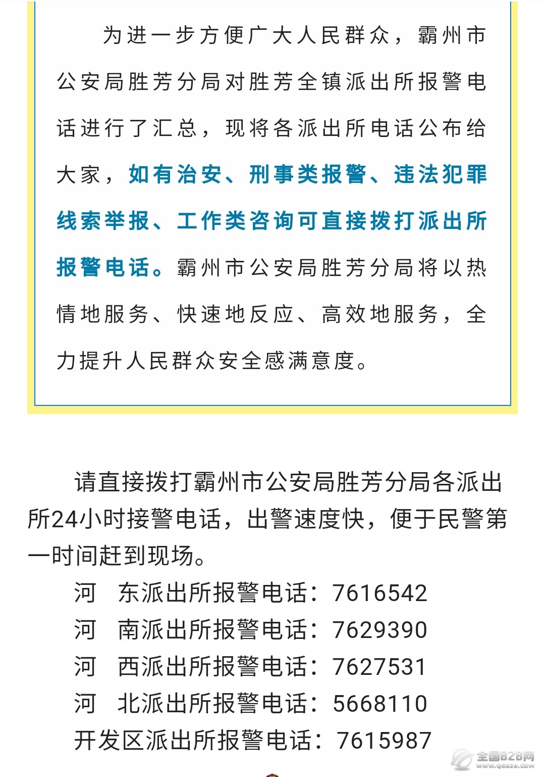 便民黄页:霸州市胜芳区各派出所值班电话大全表。为进一步方便广大人民群众,霸州市胜芳区对胜芳全镇派出所值班电话进行了汇总,现将各派出所电话公布给大家,如有治安、刑事类报警、违法犯罪线索举报、工作类咨询可直接拨打派出所报警电话。霸州市胜芳区各派出所将以热情地服务、快速地反应、高效地服务,全力提升人民群众安全感满意度。霸州市胜芳区各派出所值班电话大全表如下: