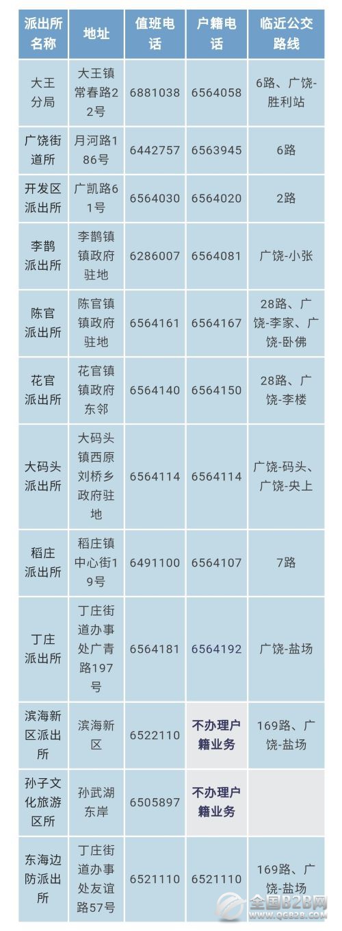 说明:关于东营市广饶县辖区派出所地址办公电话和户籍电话大全表的信息作出免责说本信息发布的目的仅为向公众提供更多的便民利民服务,是建立在公共服务信息基础上的公益信息传播,其信息来源于当地主管机构的公开内容。信息不排除因随着时间或者相关情况发生原因而发生变化变更,所以本信息仅作参考。