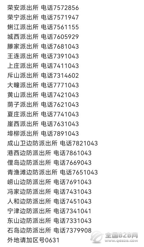 便民黄页:荣成市辖区各派出所值班联系电话大全表。荣成市辖区内各派出所联系电话大全,无论你是地道的本地人,还是刚来这里不久,总会遇到这样那样的涉及到派出所需要帮你解决的问题。遇到这些问题该找谁?怎么找?只要你拥有这本通讯录,通通一个电话搞定!