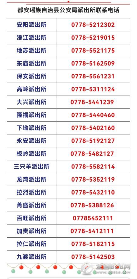 为进一步方便广大人民群众,在此我们对都安瑶族自治县辖区各派出所联系电话进行了汇总,现将各派出所电话公布给大家,如有治安、刑事类报警、违法犯罪线索举报、工作类咨询可直接拨打派出所报警电话。都安县各个派出所将以热情地服务、快速地反应、高效地服务,全力提升人民群众安全感满意度。