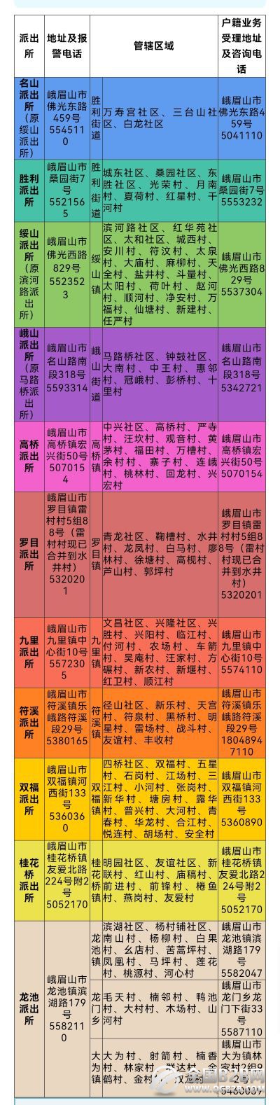 峨眉山市各派出所地址和值班电话及户籍咨询电话大全表;峨眉山市辖区现有运行派出所11个。那么四川乐山峨眉山市辖区内派出所名称、管辖区域以及值班电话、户籍咨询受理信息是怎样的呢? 办事必备!请收藏,以备不时之需哟......