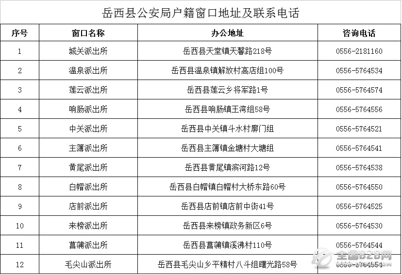 赶紧收藏了!岳西县公布所有派出所户籍室地址和咨询电话!