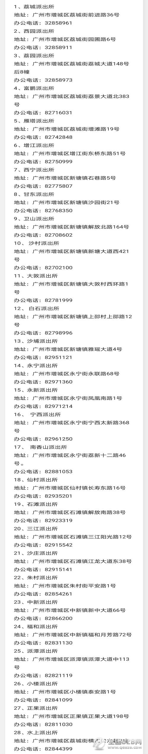 声明:关于广州市增城区各派出所办公地址和办公电话大全表的信息作出免责声明,本信息发布的目的仅为向公众提供更多的便民利民服务,是建立在公共服务信息基础上的公益信息传播,其信息来源于当地主管机构的公开内容。信息不排除因随着时间或者相关情况发生原因而发生变化变更,所以本信息仅作参考。