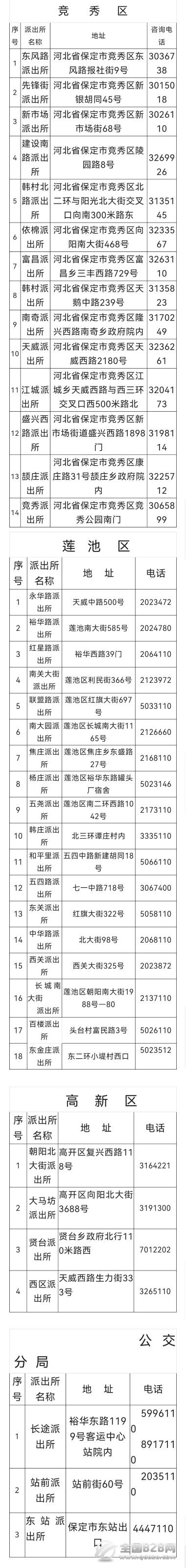 说明:关于保定市辖区派出所办公地址和联系电话大全表的信息作出免责说明,本信息发布的目的仅为向公众提供更多的便民利民服务,是建立在公共服务信息基础上的公益信息传播,其信息来源于当地主管机构的公开内容。信息不排除因随着时间或者相关情况发生原因而发生变化变更,所以本信息仅作参考。