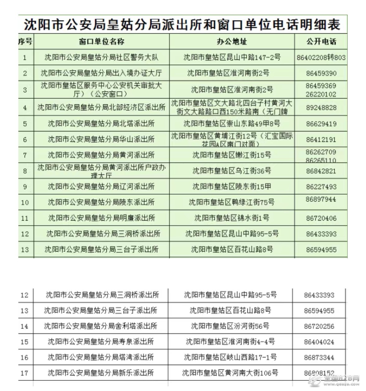 沈阳市皇姑区各基层派出所办公地址和公开电话明细表:要放大招了,辽宁省沈阳市皇姑区各基层派出所办公地址和公开电话明细表,快快收好:无论你是地道的本地人,还是刚来这里不久,总会遇到这样那样的涉及到派出所需要帮你解决的问题。遇到这些问题该找谁?怎么找?只要你拥有这本通讯录,通通一个电话搞定! 办事必备!请收藏,以备不时之需哟......
