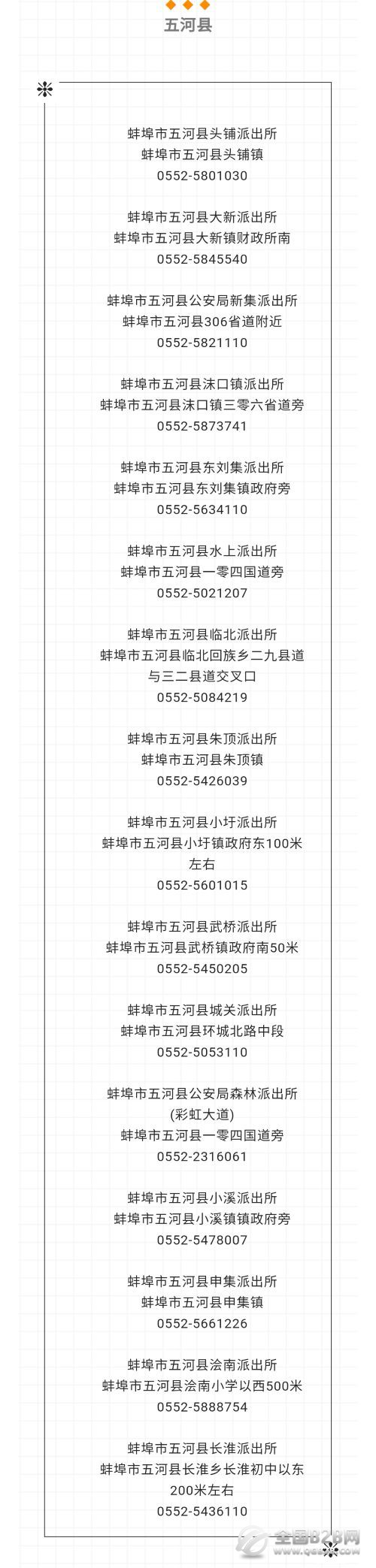提示:关于蚌埠市五河县各派出所电话地址大全表的信息作出免责提示,本信息发布的目的仅为向公众提供更多的便民利民服务,是建立在公共服务信息基础上的公益信息传播,其信息来源于当地主管机构的公开内容。信息不排除因随着时间或者相关情况发生原因而发生变化变更,所以本信息仅作参考。