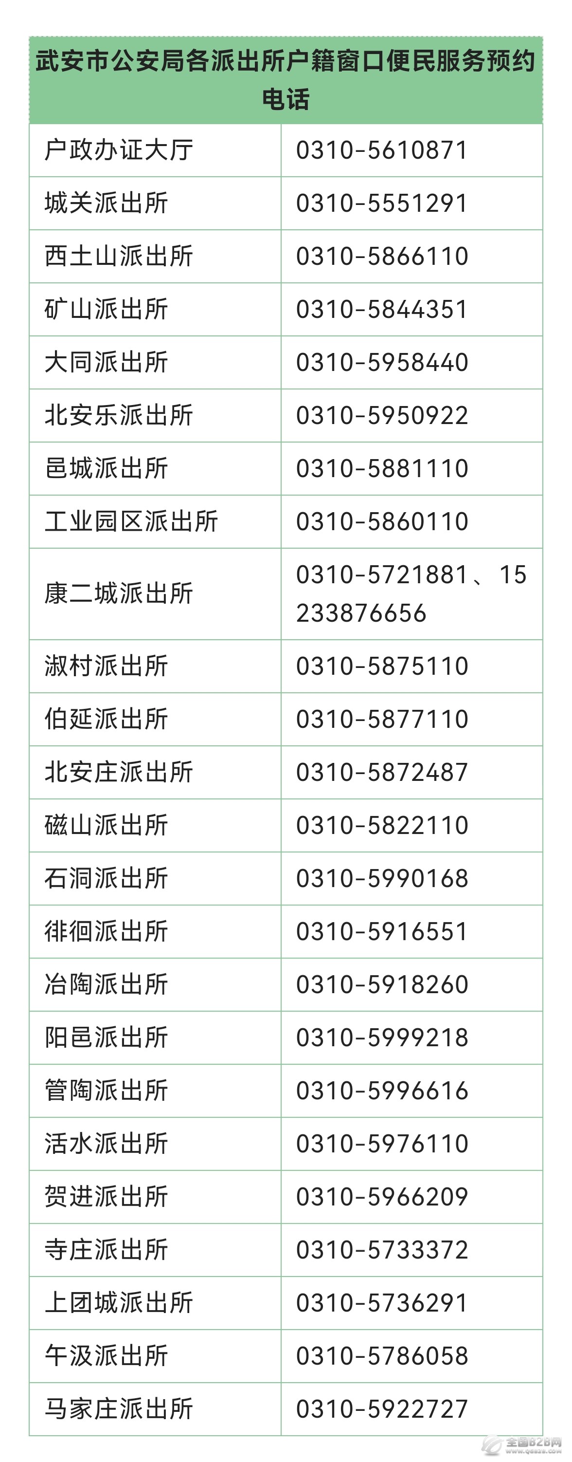 武安市辖区派出所户籍窗口便民服务预约电话大全表,武安市辖区各个派出所户籍窗口便民服务预约电话汇总大全表如下: