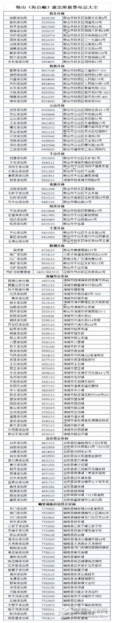 便民黄页:鞍山市(海台岫)派出所值班电话和办公地址大全表。鞍山市(海台岫)派出所值班电话和办公地址大全!无论你是地道的本地人,还是刚来这里不久,总会遇到这样那样的涉及到派出所需要帮你解决的问题。遇到这些问题该找谁?怎么找?只要你拥有这本通讯录,通通一个电话搞定!