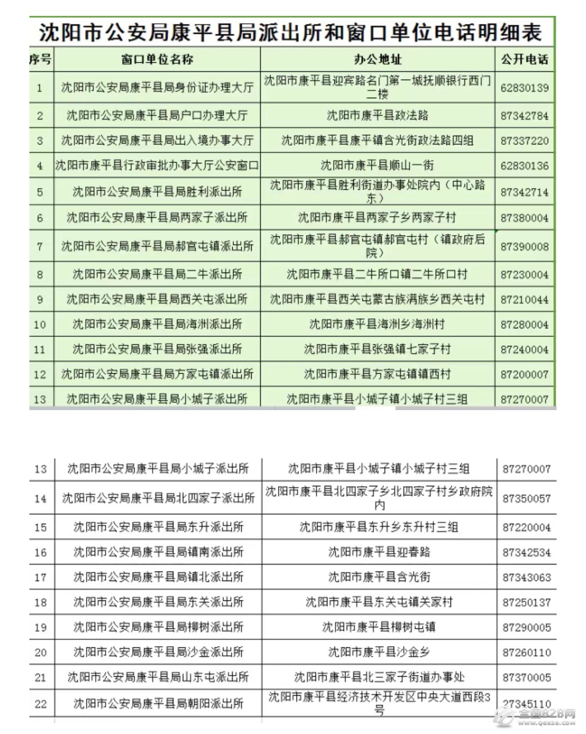 沈阳市康平县各基层派出所办公地址和公开电话明细表:要放大招了,辽宁省沈阳市康平县各基层派出所办公地址和公开电话明细表,快快收好:无论你是地道的本地人,还是刚来这里不久,总会遇到这样那样的涉及到派出所需要帮你解决的问题。遇到这些问题该找谁?怎么找?只要你拥有这本通讯录,通通一个电话搞定! 办事必备!请收藏,以备不时之需哟......
