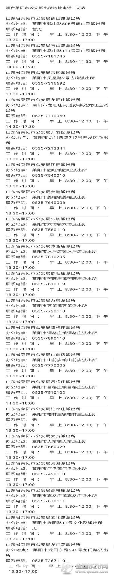 说明:关于山东烟台莱阳市各派出所地址电话一览表的信息作出免责说明,本信息发布的目的仅为向公众提供更多的便民利民服务,是建立在公共服务信息基础上的公益信息传播,其信息来源于当地主管机构的公开内容。信息不排除因随着时间或者相关情况发生原因而发生变化变更,所以本信息仅作参考。