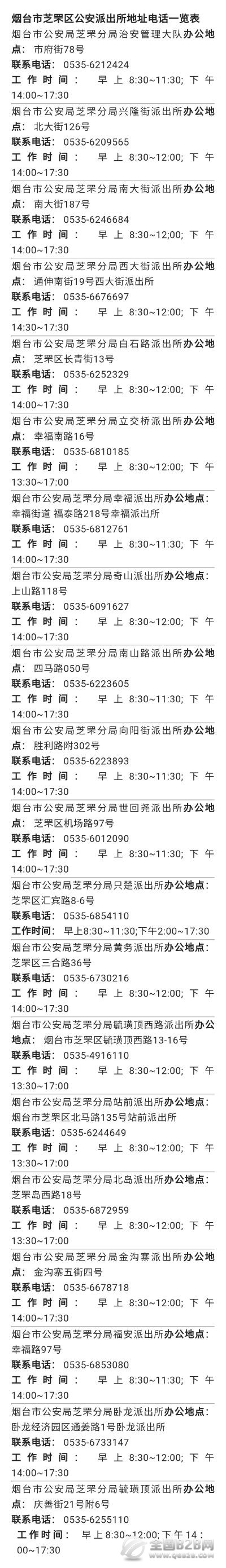 说明:关于烟台市芝罘区各派出所办公地址和联系电话一览表的信息作出免责说明,本信息发布的目的仅为向公众提供更多的便民利民服务,是建立在公共服务信息基础上的公益信息传播,其信息来源于当地主管机构的公开内容。信息不排除因随着时间或者相关情况发生原因而发生变化变更,所以本信息仅作参考。