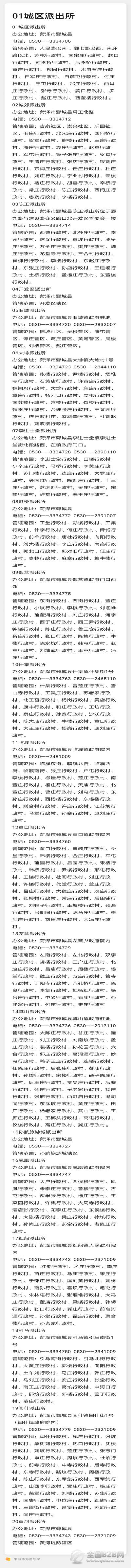 鄄城县各派出所地址、电话及业务管辖范围汇总大全表:看这里,看这里,菏泽市鄄城县各派出所地址、电话及业务范围汇总大全。 办事必备!请收藏,以备不时之需哟......有困难,找派出所。可你知道身边最近的派出所在哪儿吗?一旦发生事情,咋求助,咋联系?