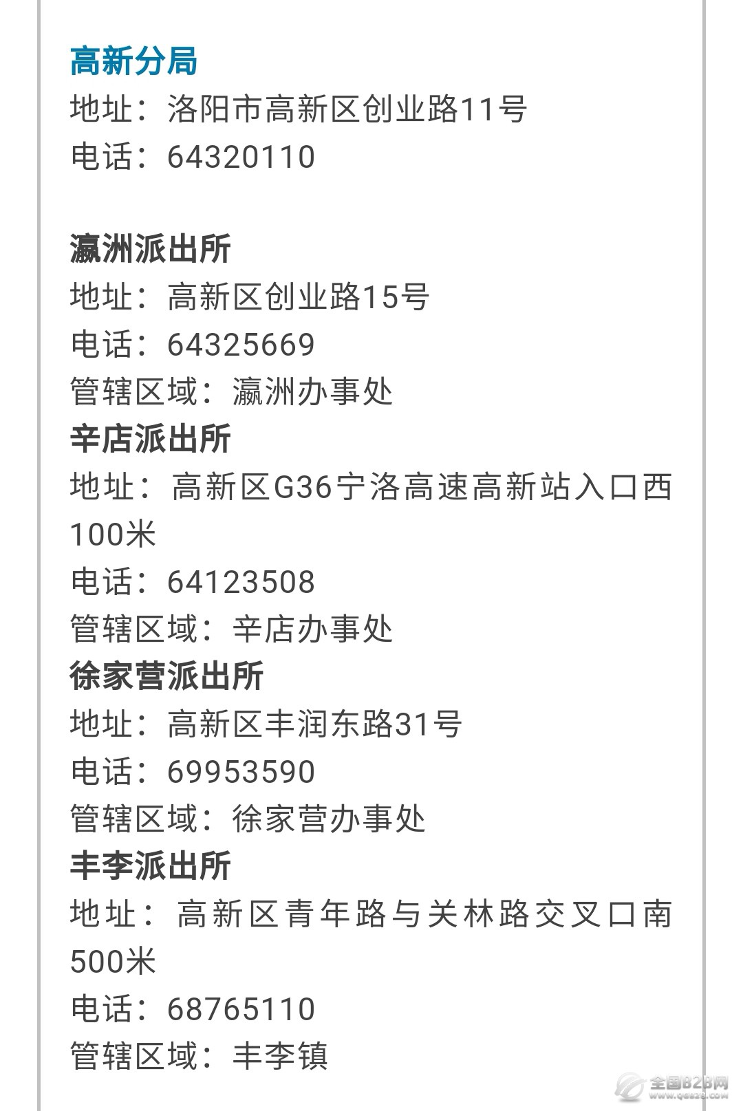说明:关于河南洛阳市高新区辖区派出所办公地址和值班电话大全表的信息作出免责说明,本信息发布的目的仅为向公众提供更多的便民利民服务,是建立在公共服务信息基础上的公益信息传播,其信息来源于当地主管机构的公开内容。信息不排除因随着时间或者相关情况发生原因而发生变化变更,所以本信息仅作参考。