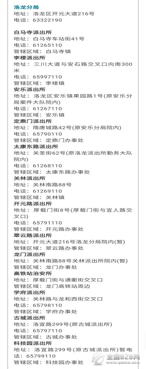 说明:关于洛阳市洛龙区各派出所办公地址和值班电话大全表的信息作出免责说明,本信息仅为提供便民服务目的而发布,相关信息来源于公开信息或第三方。本信息仅作参考,信息的准确性和完整性在此不作任何保证,也不保证所包含的信息和建议不会发生任何变更,我们仅对公开资料中的内容做原文提取或者整理转载。虽然已力求信息的客观完整,但随着时间与其它情况发生,难免信息出现差错或者变更。如果出现差错或者侵犯了您的权利,请通知本网站客服,我们将及时更正或者删除。谢谢。