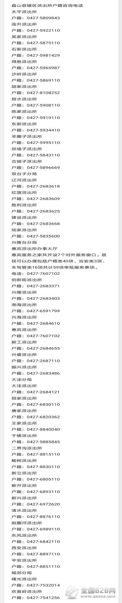 说明:关于盘锦市辖区派出所户籍窗口电话目录大全表的信息作出免责说明,本信息仅为提供便民服务目的而发布,相关信息来源于公开信息或第三方。本信息仅作参考,信息的准确性和完整性在此不作任何保证,也不保证所包含的信息和建议不会发生任何变更,我们仅对公开资料中的内容做原文提取或者整理转载。虽然已力求信息的客观完整,但随着时间与其它情况发生,难免信息出现差错或者变更。如果出现差错或者侵犯了您的权利,请通知本网站客服,我们将及时更正或者删除。谢谢。