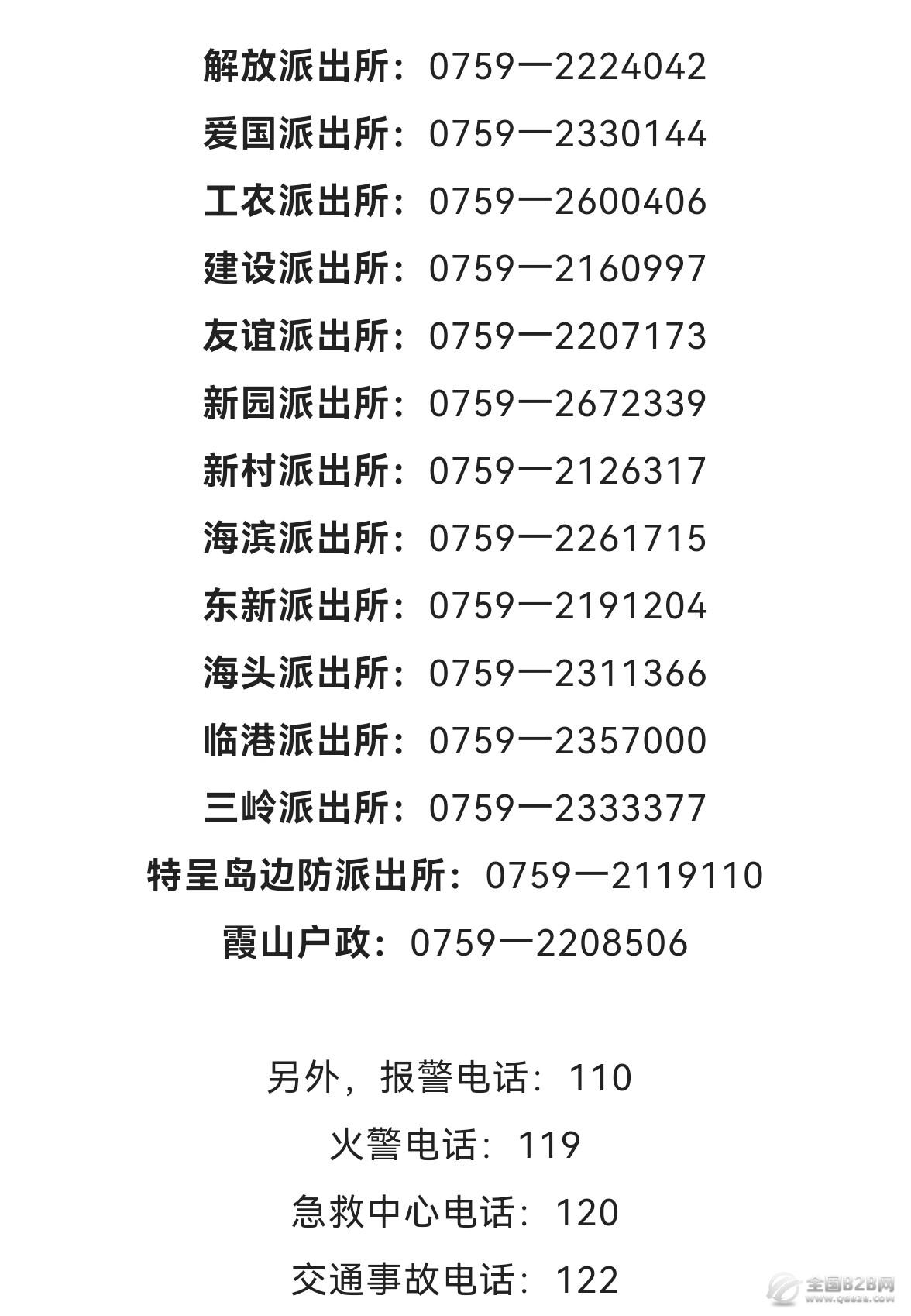 说明:关于湛江市霞山区各派出所值班电话大全表的信息作出免责说明,本信息仅为提供便民服务目的而发布,相关信息来源于湛江市主管机构之公开内容。本信息仅作参考,信息的准确性和完整性在此不作任何保证,也不保证所包含的信息和建议不会发生任何变更,我们仅对公开资料中的内容做原文提取或者整理转载。虽然已力求信息的客观完整,但随着时间与其它情况发生,难免信息出现差错或者变更。如果出现差错或者侵犯了您的权利,请通知本网站客服,我们将及时更正或者删除。谢谢。