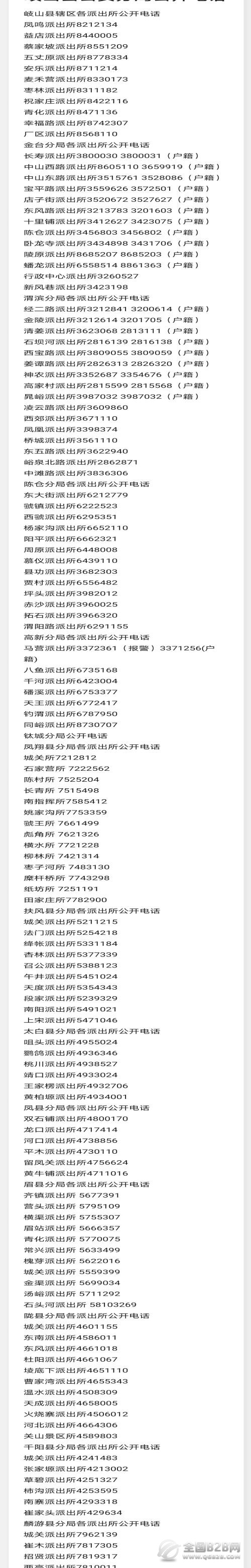 便民电话黄页:宝鸡市辖区三区九县派出所办公电话号码汇总表。宝鸡市辖区三区九县派出所便民服务电话汇总表,市民朋友们,网络热词你知道几个,我觉得有事找派出所肯定算是一个。行走宝鸡谁还没有个急事,今天小编就为大家整理一下宝鸡市辖区三区九县的派出所便民服务电话,记得收藏起来!宝鸡市辖区三区九县派出所便民服务电话号码汇总表如下: