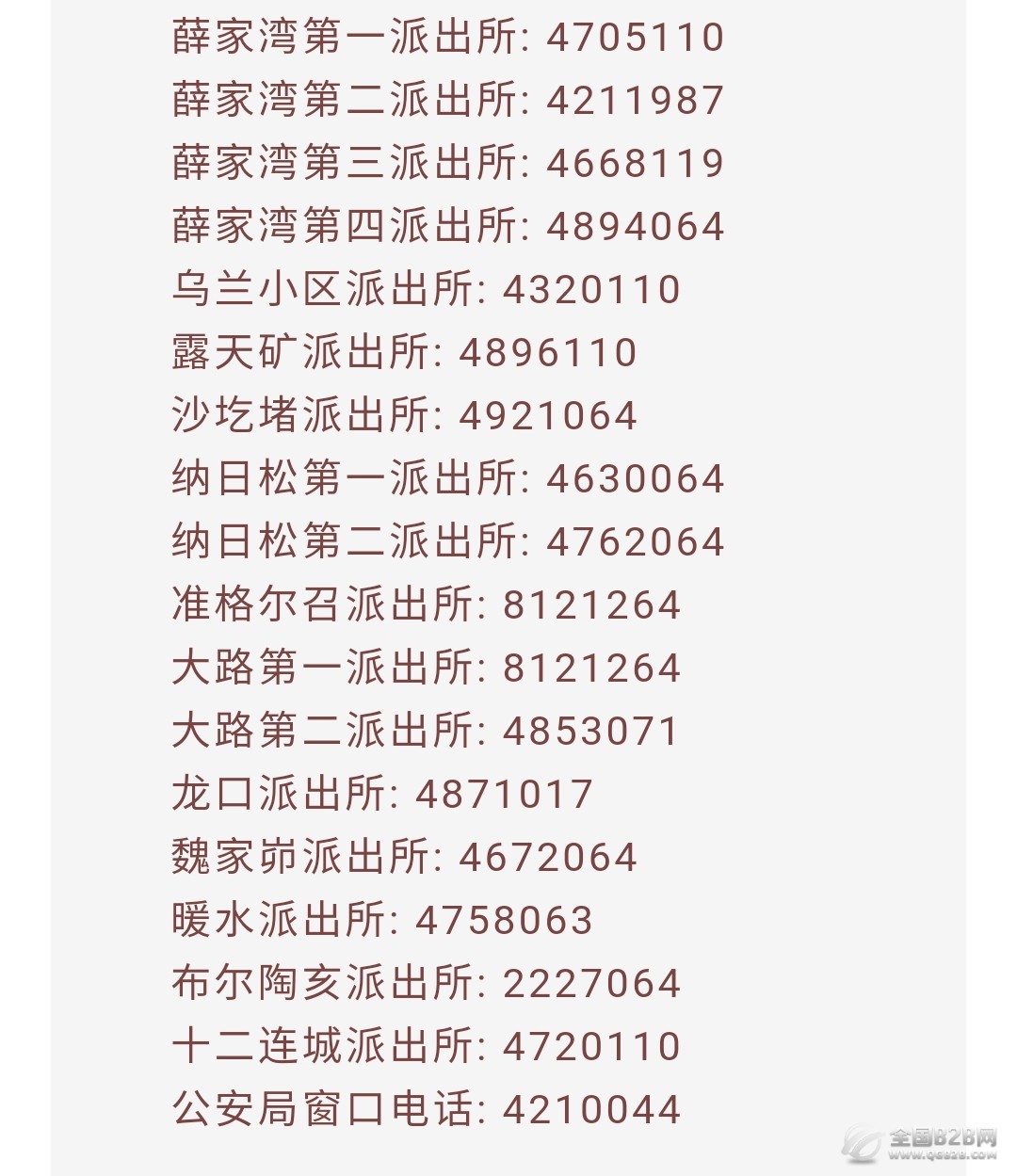 说明:关于准格尔旗辖区派出所联系电话大全表的信息作出免责说明,本信息仅为提供便民服务目的而发布,相关信息来源于准格尔主管机构之公开内容。本信息仅作参考,信息的准确性和完整性在此不作任何保证,也不保证所包含的信息和建议不会发生任何变更,我们仅对公开资料中的内容做原文提取或者整理转载。虽然已力求信息的客观完整,但随着时间与其它情况发生,难免信息出现差错或者变更。如果出现差错或者侵犯了您的权利,请通知本网站客服,我们将及时更正或者删除。谢谢。