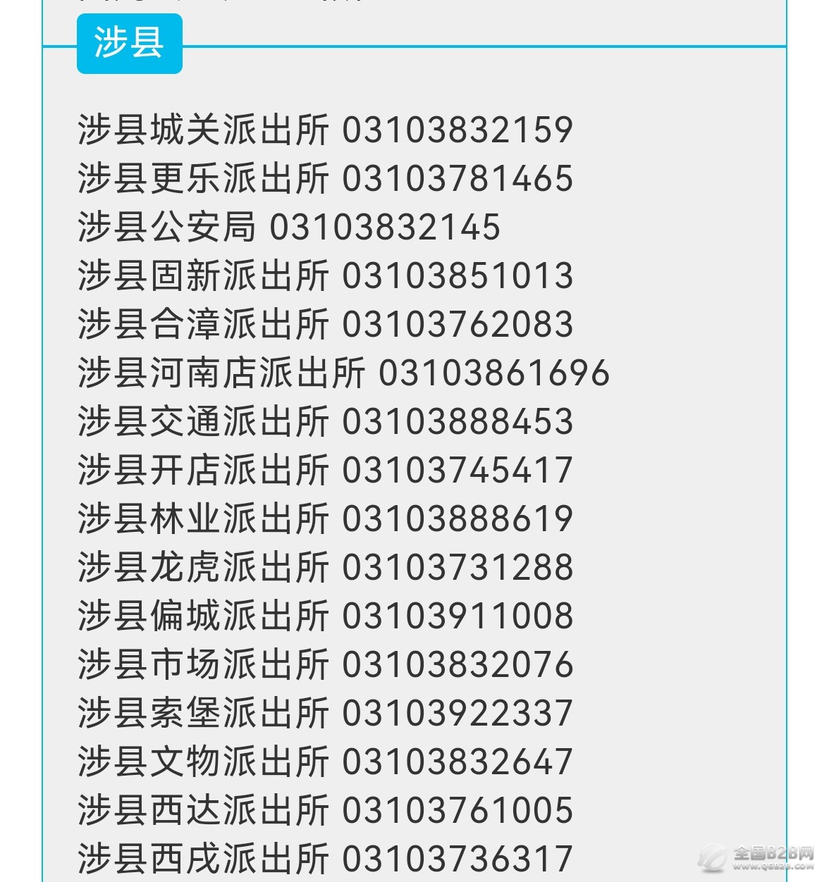邯郸市涉县辖区各派出所联系电话号码大全如下: