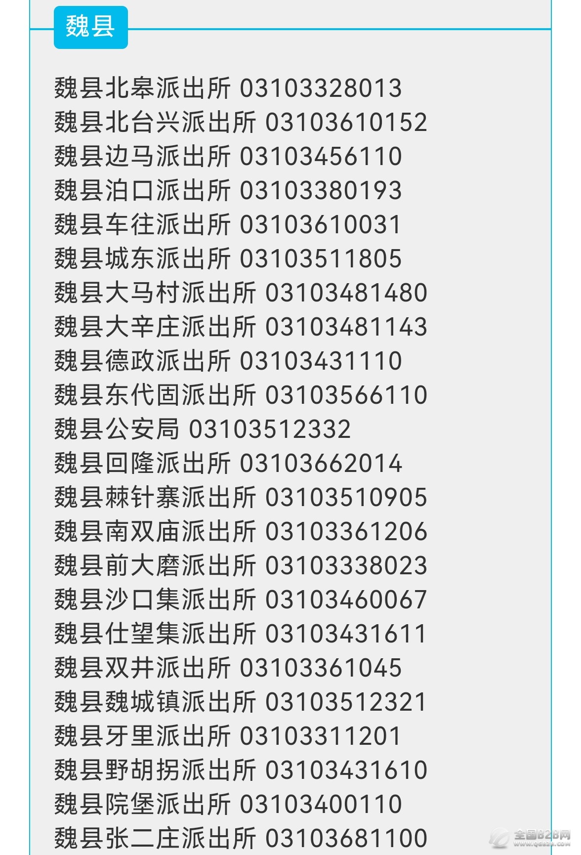 声明:关于魏县各派出所联系电话号码大全表的信息作出免责声明,本信息仅为提供便民服务目的而发布,相关信息来源于魏县主管机构之公开内容。本信息仅作参考,信息的准确性和完整性在此不作任何保证,也不保证所包含的信息和建议不会发生任何变更,我们仅对公开资料中的内容做原文提取或者整理转载。虽然已力求信息的客观完整,但随着时间与其它情况发生,难免信息出现差错或者变更。如果出现差错或者侵犯了您的权利,请通知本网站客服,我们将及时更正或者删除。谢谢。