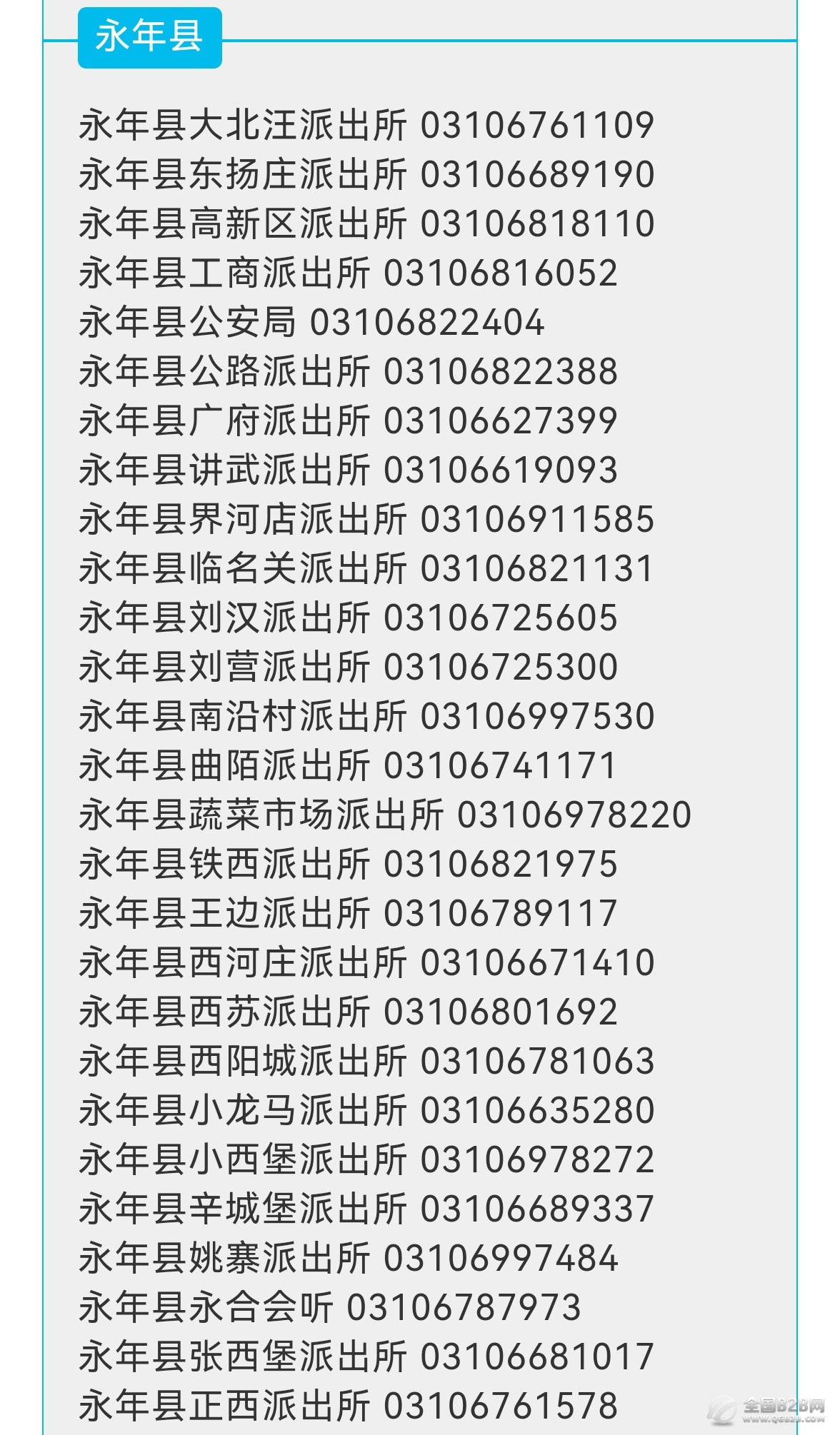 邯郸市永年县各派出所联系电话号码大全如下: