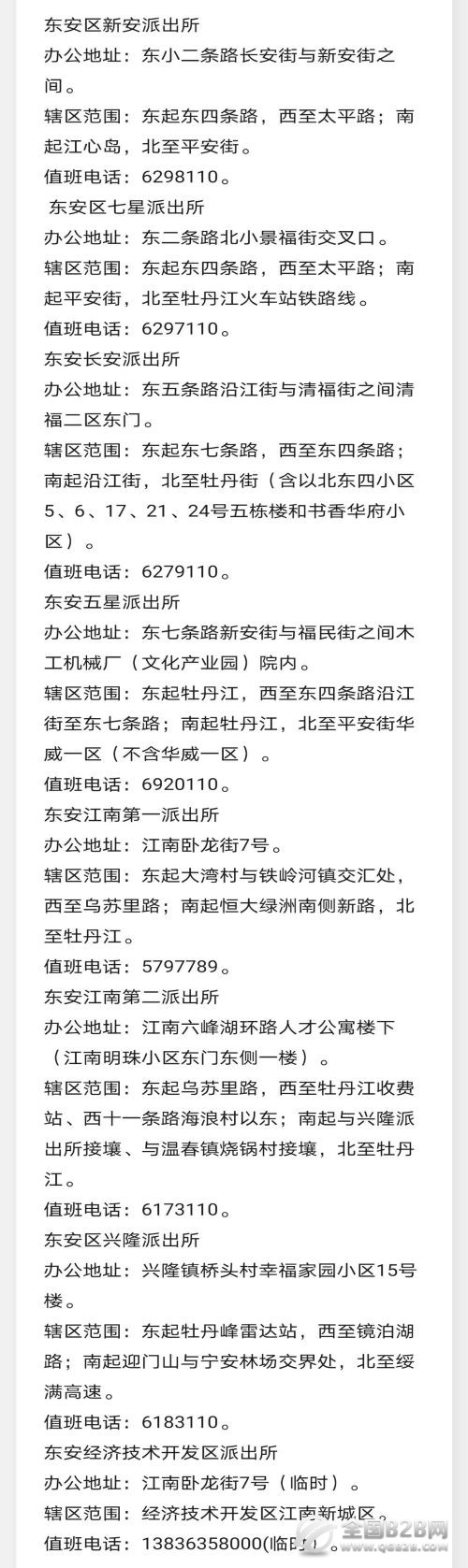 说明:关于牡丹江市东安区各派出所值班电话和办公地址汇总表的信息作出免责说明,本信息仅为提供便民服务目的而发布,相关信息来源于牡丹江市主管机构之公开内容。本信息仅作参考,信息的准确性和完整性在此不作任何保证,也不保证所包含的信息和建议不会发生任何变更,我们仅对公开资料中的内容做原文提取或者整理转载。虽然已力求信息的客观完整,但随着时间与其它情况发生,难免信息出现差错或者变更。如果出现差错或者侵犯了您的权利,请通知本网站客服,我们将及时更正或者删除。谢谢。