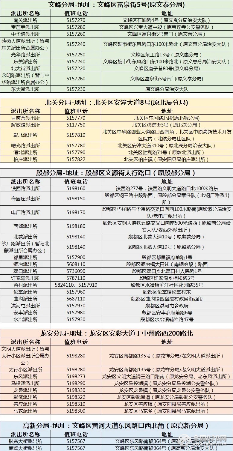 说明:关于安阳市市区各派出所办公地址和值班电话大全表的信息作出免责说明,本信息仅为提供便民服务目的而发布,相关信息来源于安阳市主管机构之公开内容。本信息仅作参考,信息的准确性和完整性在此不作任何保证,也不保证所包含的信息和建议不会发生任何变更,我们仅对公开资料中的内容做原文提取或者整理转载。虽然已力求信息的客观完整,但随着时间与其它情况发生,难免信息出现差错或者变更。如果出现差错或者侵犯了您的权利,请通知本网站客服,我们将及时更正或者删除。谢谢。
