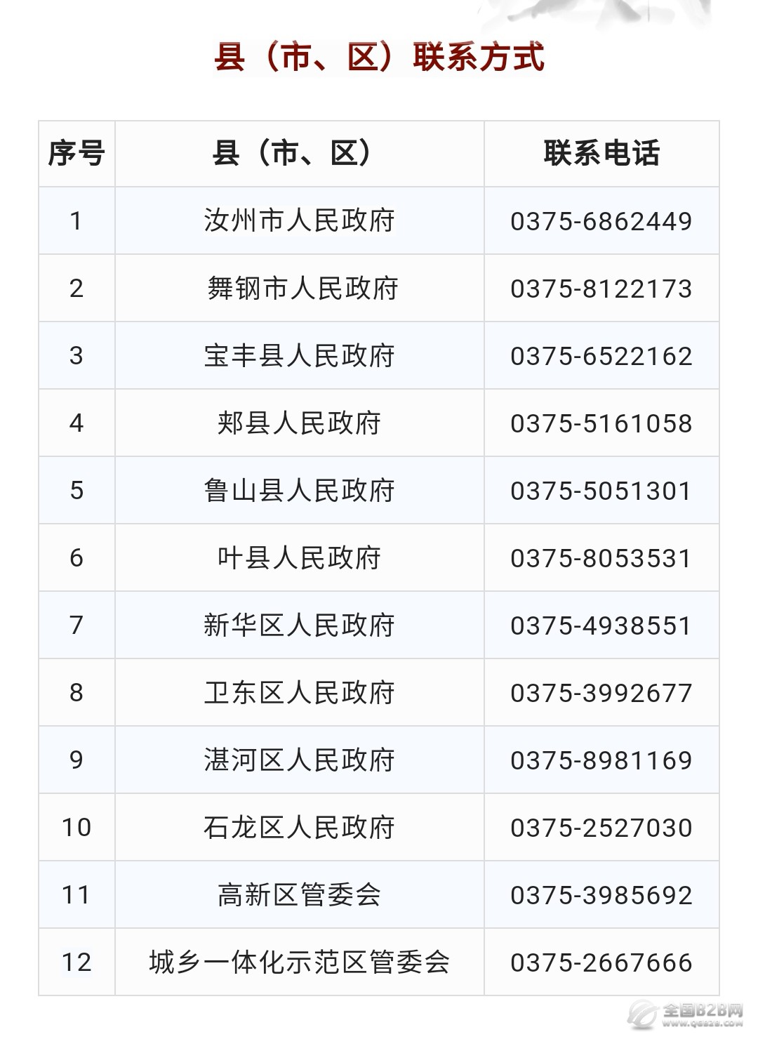 便民电话黄页:平顶山市县(市、区)人民政府联系方式大全表。