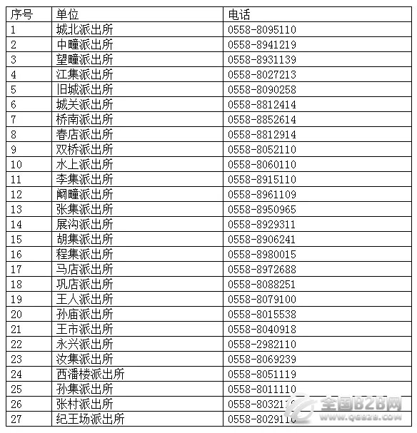 说明:关于利辛县各派出所办公电话号码大全表的信息作出免责说明,本信息仅为提供便民服务目的而发布,相关信息来源于利辛县主管机构之公开内容。本信息仅作参考,信息的准确性和完整性在此不作任何保证,也不保证所包含的信息和建议不会发生任何变更,我们仅对公开资料中的内容做原文提取或者整理转载。虽然已力求信息的客观完整,但随着时间与其它情况发生,难免信息出现差错或者变更。如果出现差错或者侵犯了您的权利,请通知本网站客服,我们将及时更正或者删除。谢谢。