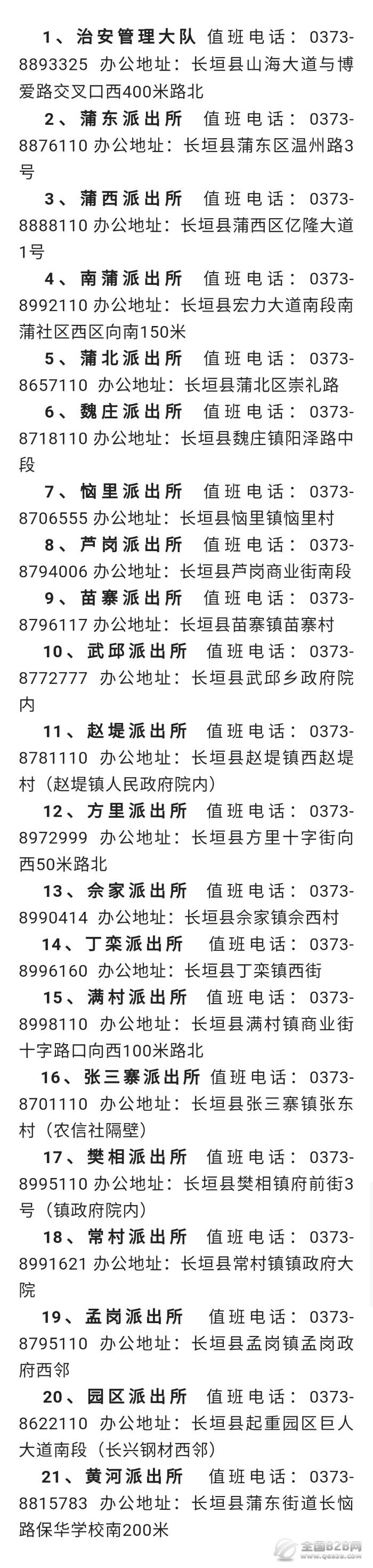 便民电话黄页:长垣县辖区派出所值班电话和办公地址大全表。欢迎关注长垣县辖区各派出所!我们携同全县各派出所将全天候24小时为您保平安!长垣县辖区各派出所值班电话和办公地址大全: