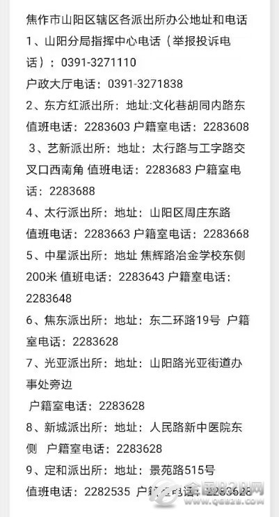 焦作市山阳区各派出所联系电话和办公地址大全表如下: