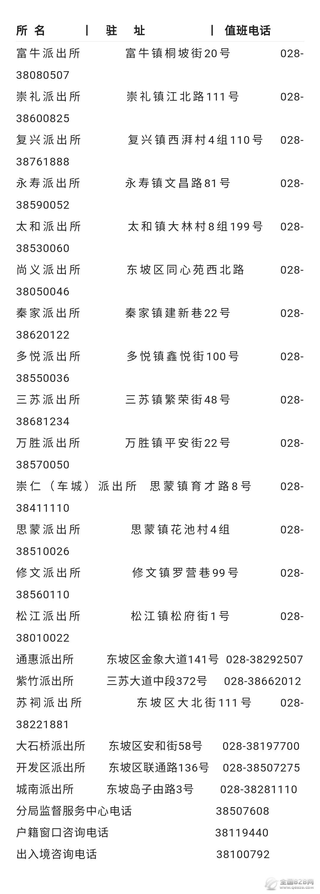 四川眉山市东坡区各派出所地址和值班电话大全表。