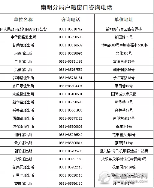 贵阳市南明区派出所户籍办理窗口咨询电话和地址信息汇总表。