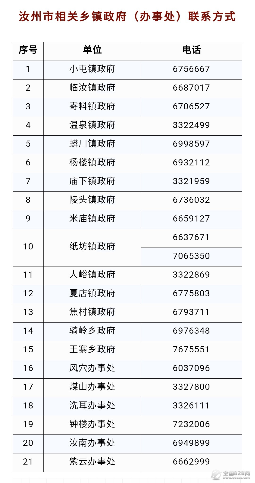 汝州市相关乡镇政府(街道办事处)服务电话汇总表如下: