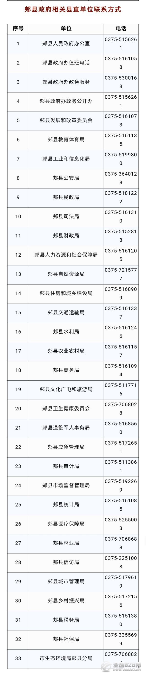 郏县政府相关县直机关单位便民服务联系方式汇总表如下: