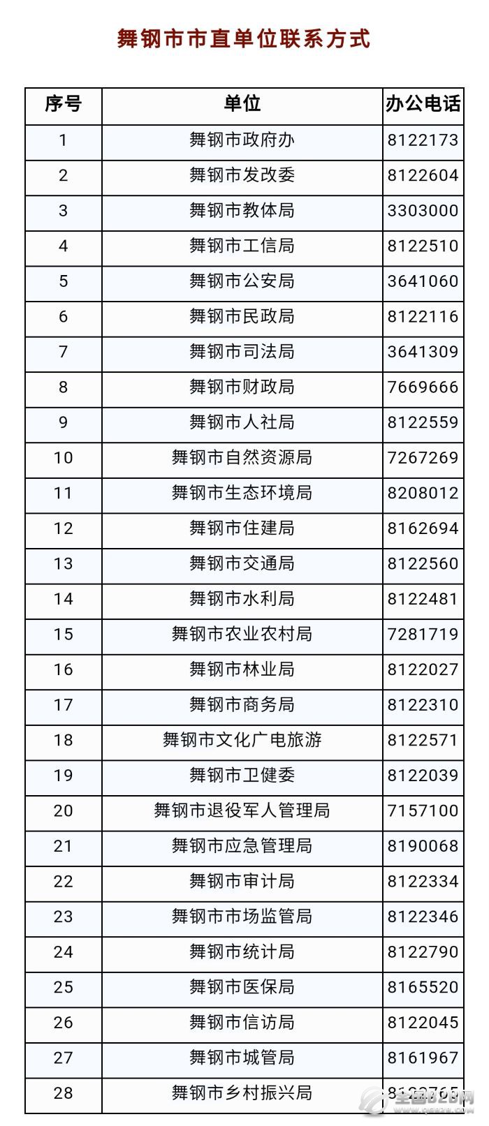 便民信息黄页:舞钢市政府相关直属单位联系方式电话大全表。