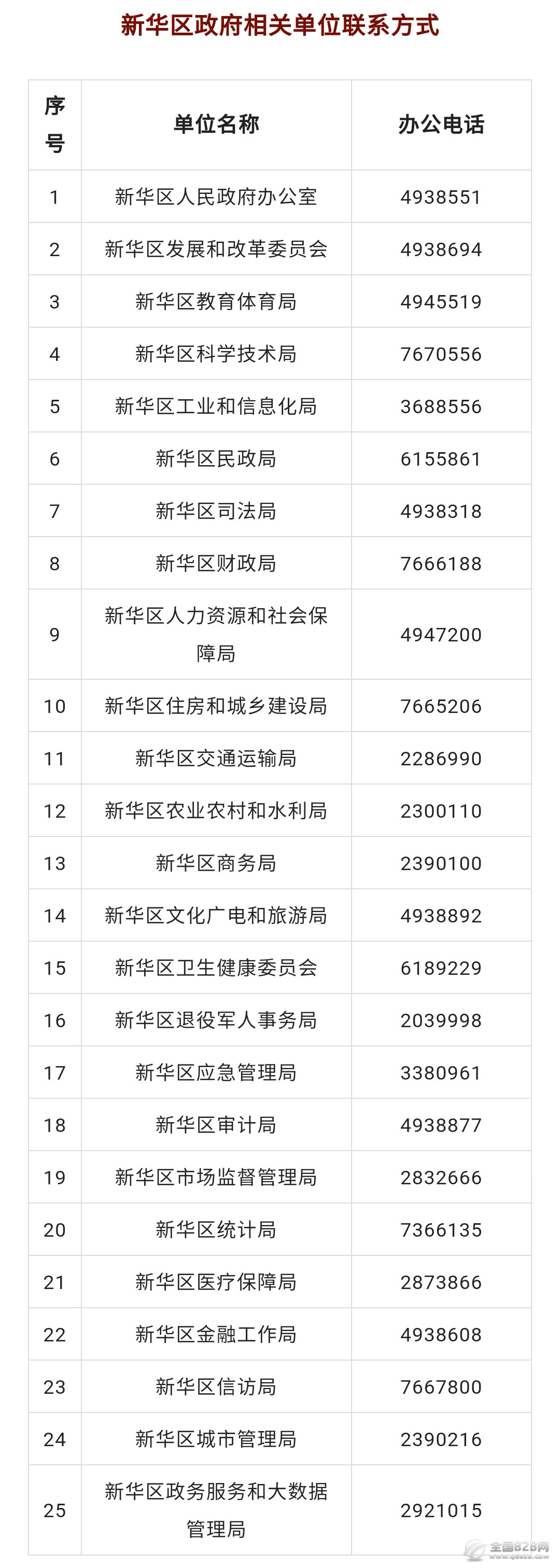 平顶山市新华区政府相关直属单位(办公电话)联系方式汇总表。