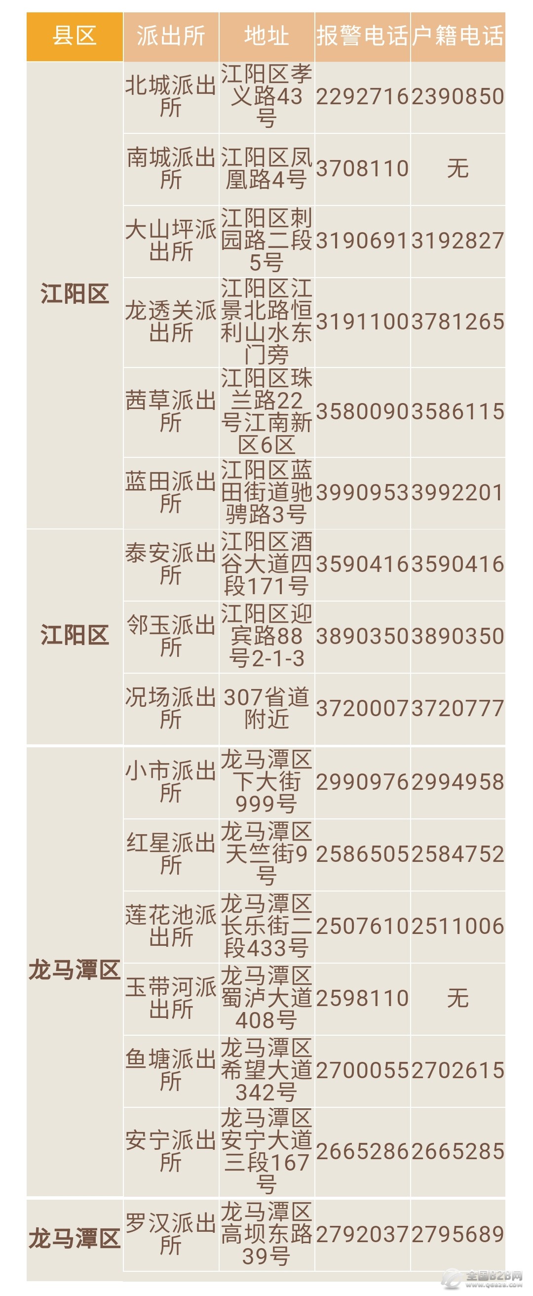 说明:关于泸州市阳江区和龙马潭区主城区派出所报警电话及户籍电话大全表的信息作出免责说明,本信息仅为提供便民服务目的而发布,相关信息来源于泸州市主管机构之公开内容。本信息仅作参考,信息的准确性和完整性在此不作任何保证,也不保证所包含的信息和建议不会发生任何变更,我们仅对公开资料中的内容做原文提取或者整理转载。虽然已力求信息的客观完整,但随着时间与其它情况发生,难免信息出现差错或者变更。如果出现差错或者侵犯了您的权利,请通知本网站客服,我们将及时更正或者删除。谢谢。