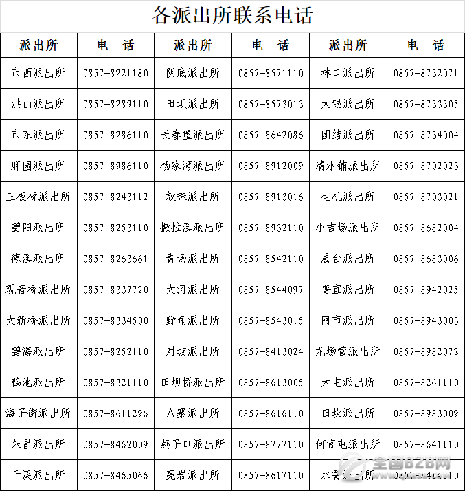 政府便民信息公开:毕节市七星关区各派出所联系电话号码大全表。